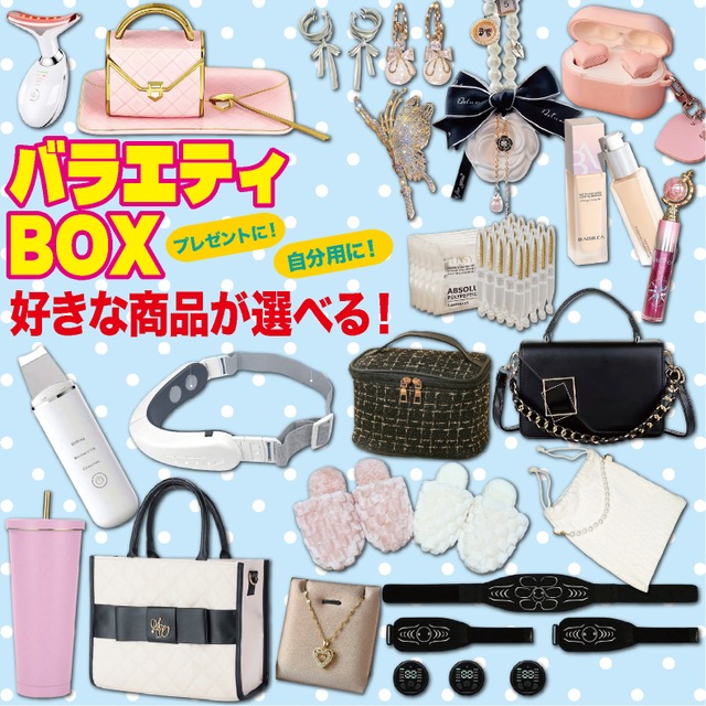 価格に応じて自分の好きな商品をお選びいただくことができるバラエティボックスです! 自分へのご褒美としてはもちろん、クリスマスや特別な日のプレゼント、ギフトにも最適です。 おしゃれでかわいいアイテムが集まったこのボックスは、きっと喜ばれること間違いなしです! ******* 【お願い】 備考欄にご希望の商品をお伝えください。 【価格】 ・3500円タイプ ・5500円タイプ ・10000円タイプ ・15000円タイプ 【商品個数】 ※3500円タイプの商品数:4個 ※5500円タイプの商品数:5個 ※10000円タイプの商品数:6個 ※15000円タイプの商品数:7個 ★☆画像に商品の詳細を表記しておりますので、ご希望の商品をお選びください。 【商品ラインナップ】 ★3500円タイプ:4個(各1個ずつ)お選びください ★5500円タイプ:4個(各1個ずつ)お選びください ★10000円タイプ4個(各1個ずつ)お選びください ★15000円タイプ:4個(各1個ずつ)お選びください ・スリッパ:1個 ・巾着ポーチ:1個 ・ピアス:1セット ・イヤリング:1セット ・マジックキャッスルリップグロス :1個 ・大容量コスメバッグ:1個 ・バタフライクリップ:1個 ・ダンシングネックレス1個 ******** ★5500円タイプ:1個お選びください ★10000円タイプ:2個(各1個ずつ)お選びください ★15000円タイプ:2個(各1個ずつ)お選びください ・フェイスリフト:1台 ・ウォーターピーリング:1台 ・ワイヤレスイヤホン:1個 ・タンブラー750mlベビーピンク:1個 ・コーヒーカップソーサーセット:1セット ・車のペンダント:1個 ・コラーゲン :1セット(25本入り) ******** ★15000円タイプ:1個お選びください ・ショルダートートバッグ:1個 ・クロスボディーショルダーバッグ:1個 ・腹筋ベルト:1台 ・フェイス美顔器:1台 **注意事項** 2枚目の画像に表記あり バラエティボックス 福袋 クリスマス ネックレス リップ グロス ファンデーション リキッド バッグ ショルダーバッグ 美顔器 EMS 腹筋 ダイエット タンブラー ステンレス ウォーターピーリング コラーゲン 美容液 マグカップ セット イヤリング ピアス ワイヤレス イヤホン プレゼント ギフト たるみ シワ
