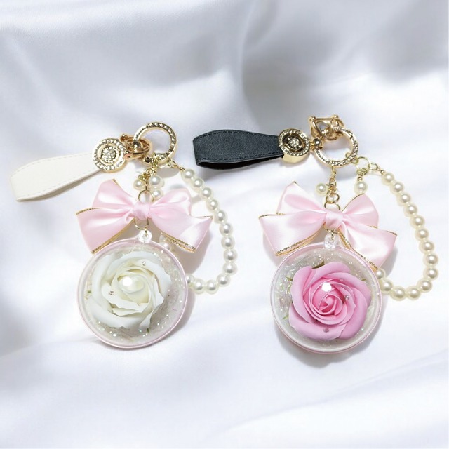 エレガントローズキーホルダーは、華やかなバラをカプセルに閉じ込めたおしゃれでかわいいキーホルダーです! ラインストーンの輝きが、どんなバッグにも華やかさをプラスします。 バラにはスワロフスキーがついております。 家の鍵や車のキーを取り付けることも可能です。 また、リング状のカラビナがついておりますので、鍵をつける以外にもバッグチャームとしても優れたアイテムす! 普段使いはもちろん、特別な日のギフトとしても最適ですので母の日や誕生日、クリスマスなどのお祝いにぴったりの贈り物です! 【素材】 チャーム:レザー(ブラック・ホワイト) フェイクパール リボン:サテン バラ:ソープフラワー ストーン:ラインストーン ※バラ部分はスワロフスキーを使用 【サイズ】 画像に表記あり ********* 【ご購入前にご確認ください】 ・本商品は若干の色合いや形状に個体差がある場合がございます。 ・強い衝撃や水濡れにはご注意いただき優しくお取り扱いください。 ・撮影環境やお使いのモニターにより、実物と色味が異なる場合がございます。 ・小さなお子様やペットの手の届かない場所に保管してください。 ・本商品を振り回したりしないでください。破損の原因になります。 ・火の近くにおかないでください。