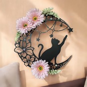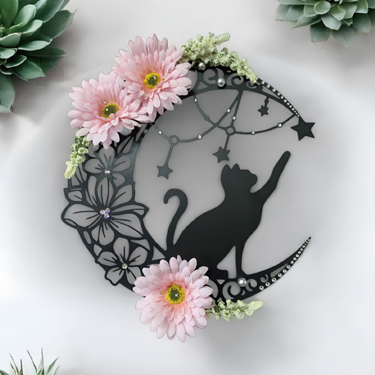 おしゃれでかわいい「花咲く月の猫リース」は、神秘的なデザインが魅力的なインテリアアイテムです!